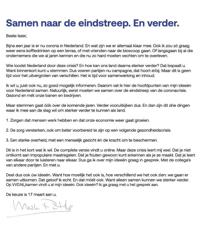 Dat is waarom ik opnieuw premier wil worden. De komende periode hoop ik in gesprek te gaan over mijn ideeën. Met de collega’s van andere partijen en met u. Om te horen waar ik het bij het juiste eind heb, en waar het volgens u anders moet. In een tijd als deze campagne voeren heb ik ook nog nooit gedaan. Ook hier zullen we met elkaar moeten uitvinden hoe dat het beste gaat en wat gepast is. Zodat u straks uw keuze kunt maken. Want op 17 maart is de keuze aan u.